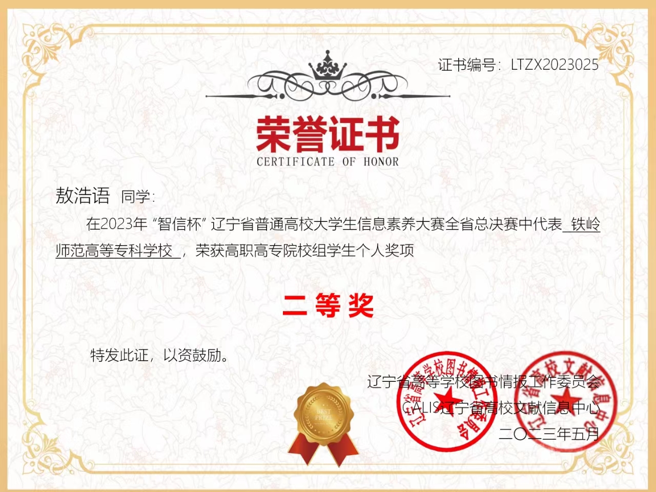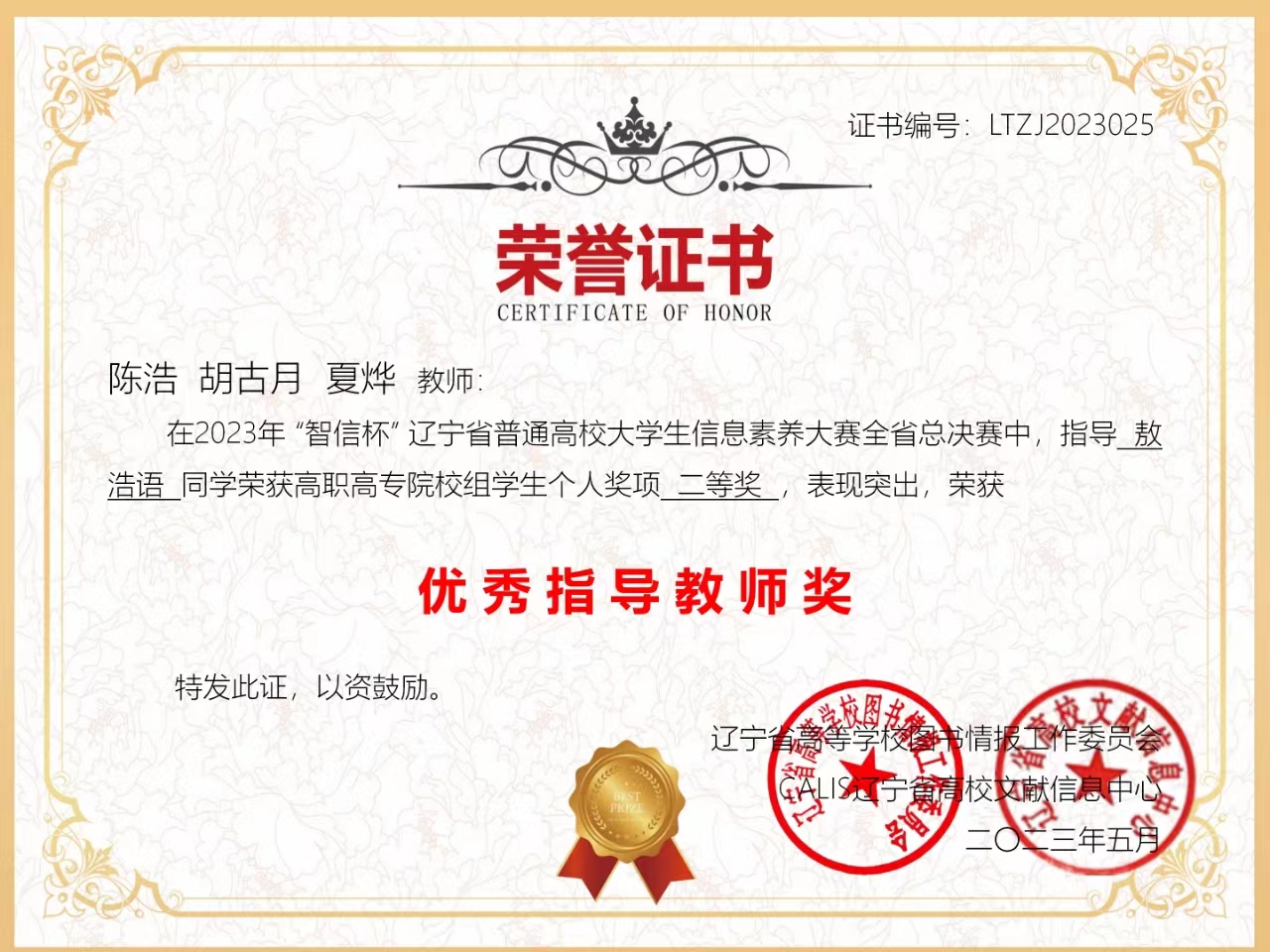 我校图书馆积极组织学生参赛,通过组建大赛选手交流群、对到馆学生现场指导等方式,提升参赛选手信息素养水平。在大赛中,我校学生克服备赛压力,稳扎稳打,反复演练,最终有4名学生获奖。其中,艺术学院学生敖浩语获高职高专组学生个人二等奖、文学院学生古晋获高职高专组学生个人三等奖、文学院学生李雪楠和邱明霞均获高职高专组学生个人优秀奖,陈浩、胡古月、夏烨、孟金秋四位老师获“优秀指导教师”奖。